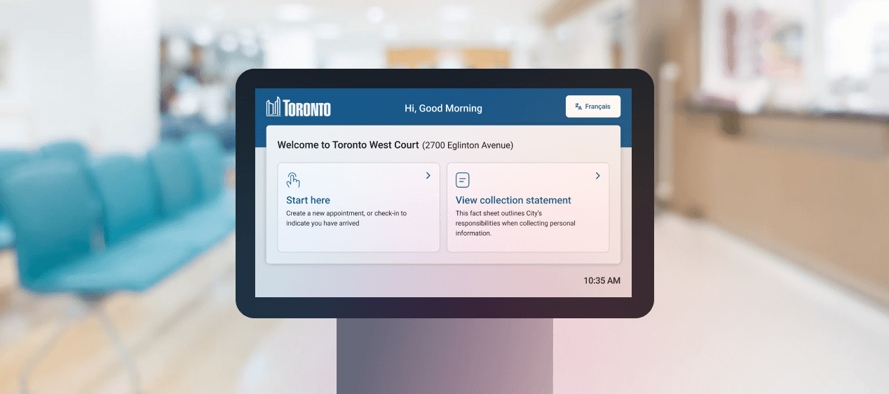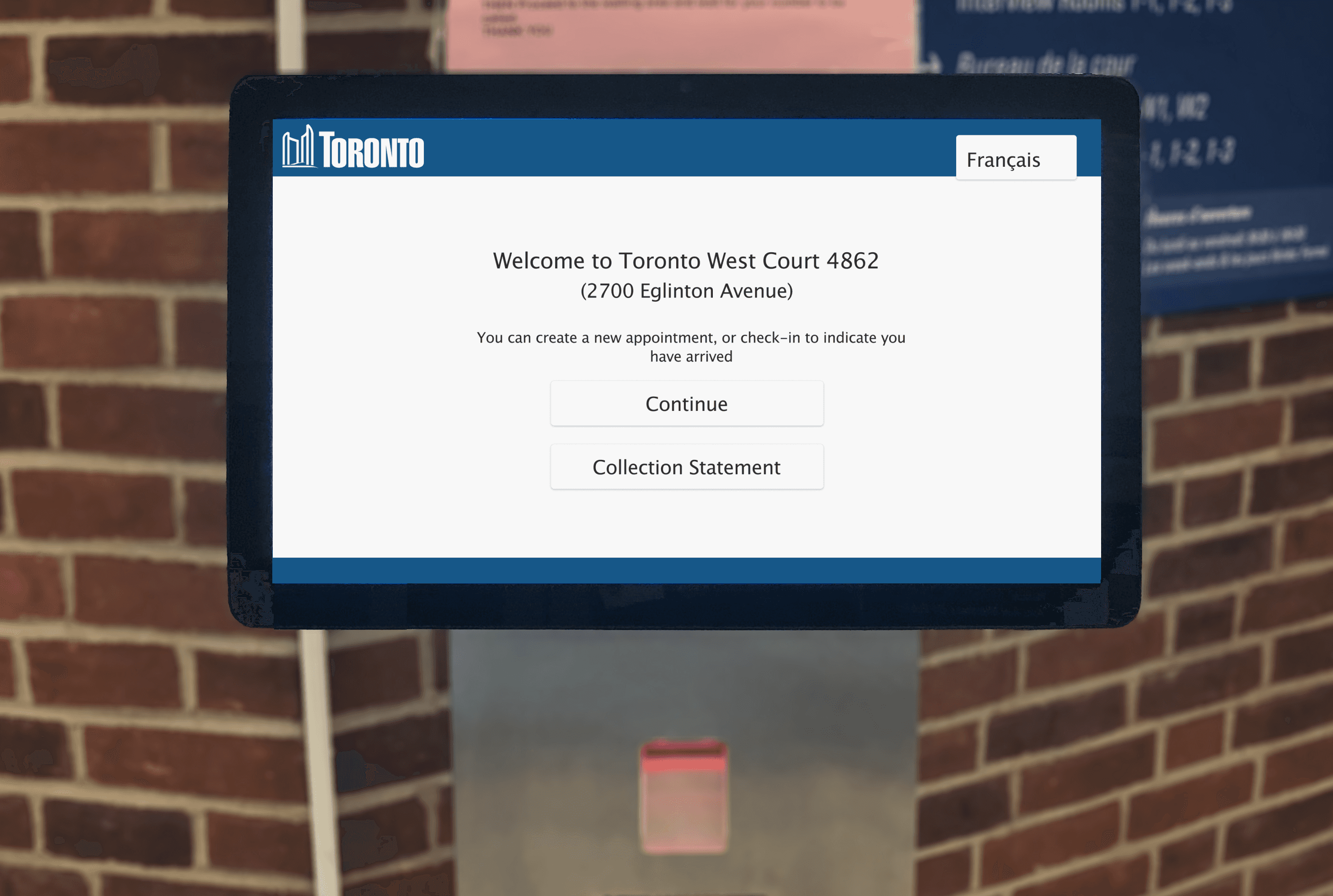 The city's existing Virtual Queue Management System (VQMS) consists of three essential user touchpoints: digital kiosk (as shown in 1.0 image), paper tickets printed by the kiosks, and information displays that show ticket numbers with audio announcements. Upon arrival, individuals with appointments can check in at the kiosks using the phone number provided at the time of their appointment. Walk-ins without appointments can also use these kiosks to print a ticket and join the virtual queue.