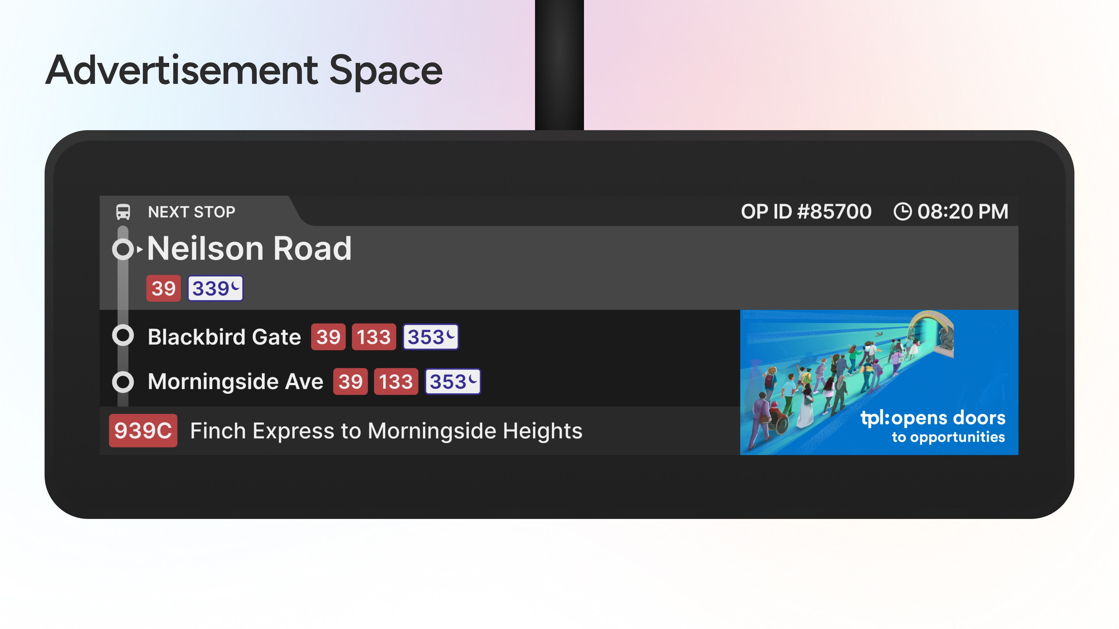 The surplus space on the information display can also serve as a platform for advertising, creating an additional revenue stream. By offering this space to businesses, public transit agencies can secure supplementary funds to enhance the quality and reliability of services for commuters. This approach not only supports a better transit experience but also generates a 'snowball effect' by improving overall services